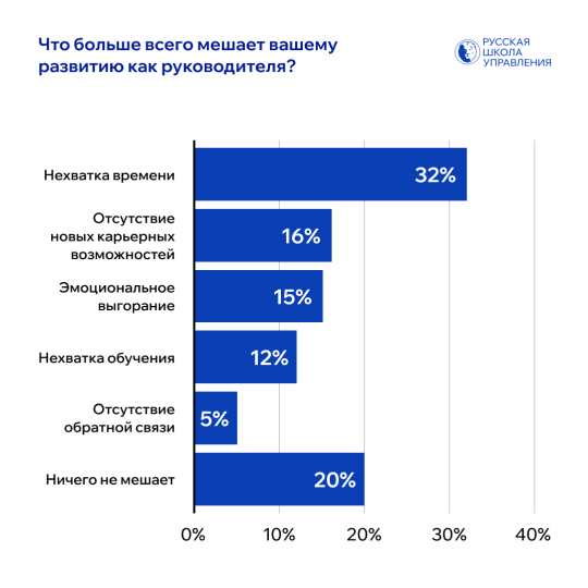 Когда речь заходит о барьерах, которые мешают дальнейшему росту, большинство управленцев называют нехватку времени — эту проблему отметили 32% участников исследования. Далее следуют отсутствие карьерных возможностей (16%) и эмоциональное выгорание (15%). Еще 12% говорят о нехватке обучения, а 5% — об отсутствии обратной связи. При этом 20% считают, что ничто не мешает их развитию, что говорит о разной степени зрелости и устойчивости руководителей.