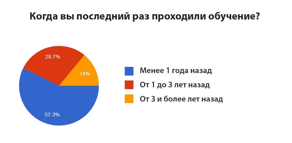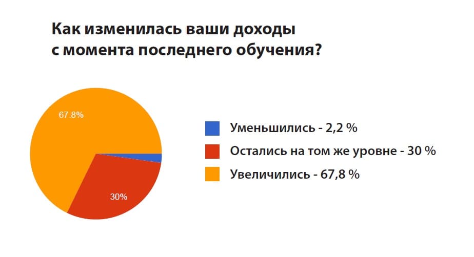 Результаты опроса показали, что у абсолютного большинства респондентов (67,8%) увеличиваются доходы после прохождения обучения. Причем происходит это довольно быстро: большая часть опрошенных обучалась менее 1 года назад (57,8%) или от 1 года до 3 лет назад (28,7%).