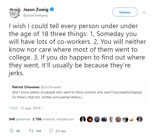 Джейсон Цвейг из Wall Street Journal написал в Твиттере: «Если бы я мог предупредить каждого человека моложе 18 лет о трех вещах:
